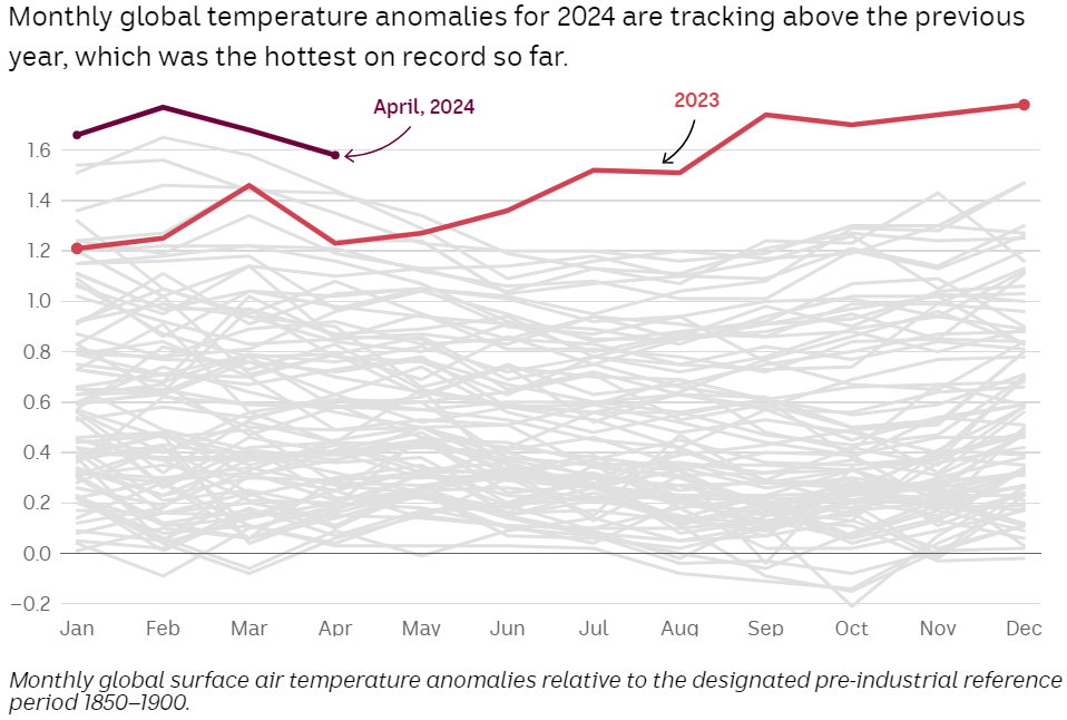 自 2023 年 6 月以来,全球高温一直没有间断过,上个月延续了这一长期破纪录的势头,4 月份连续第 11 个月刷新全球月平均气温纪录。