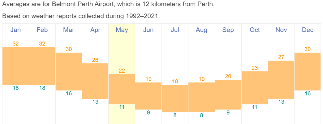 5 月到现在 17 天,平均最高气温接近 27 摄氏度,而从 1992–2021 的统计数据来看,珀斯 5 月的平均最高气温只有 22 摄氏度。
