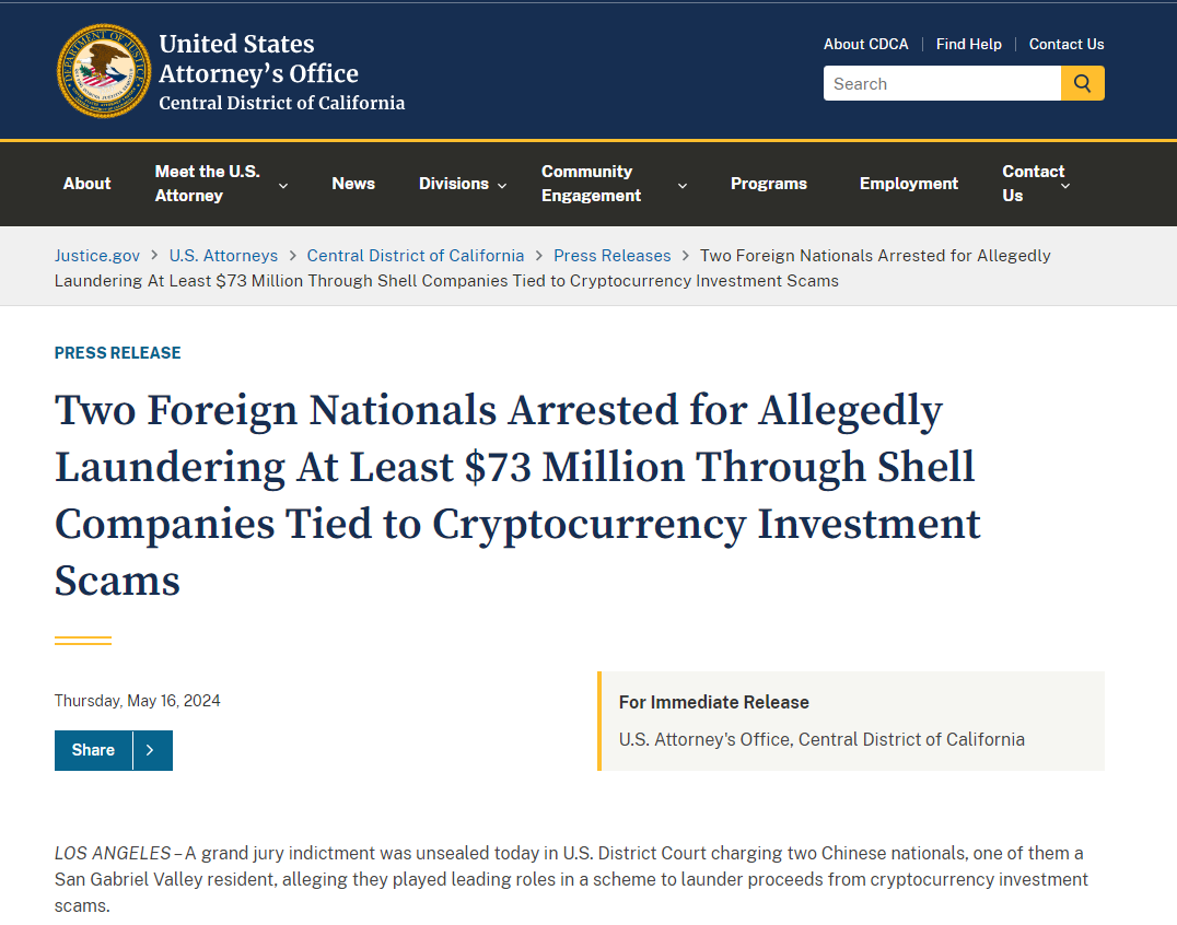 据美国司法部5月16日发布的信息,美国地方法院公布了一份大陪审团起诉书,指控两名中国公民在一项杀猪盘洗钱计划中发挥了主导作用,其中一人是圣盖博谷居民,另一人是天普市(Temple City)居民。