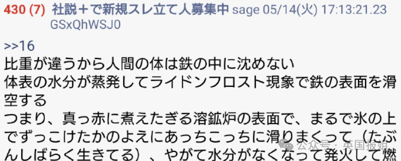 据这位相关从业人士透露:因为人体和钢水的比重不同,所以跌落后不会立即沉没。反而会在钢水表面滚来滚去,等到水分蒸发完毕才会化为灰烬。这里可以脑补,水在滴入烧热的锅里滚来滚去的样子... ...
