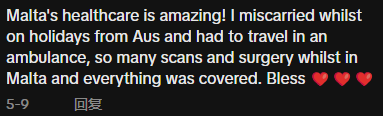 “马耳他的医疗保健水平真是棒极了!我从澳洲去度假期间流产,不得不乘坐救护车旅行,在马耳他期间进行了多次扫描和手术,一切都得到了保障。”