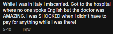 “我在意大利的时候流产了。到了医院,没有人会说英语,但是医生很棒。当我得知不需要支付任何费用的时候,我很震惊!”