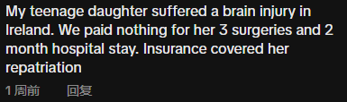 “我女儿在爱尔兰脑部受伤。我们无需支付她3次手术和2个月的住院费用。保险还覆盖了将她转移回国的费用。”