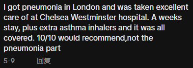 “我在伦敦得了肺炎,在切尔西威斯敏斯特医院得到了很好的照顾。住了一个星期,再加上额外的哮喘吸入器,一切费用都报销了。我满分推荐,不是指肺炎那部分。”
