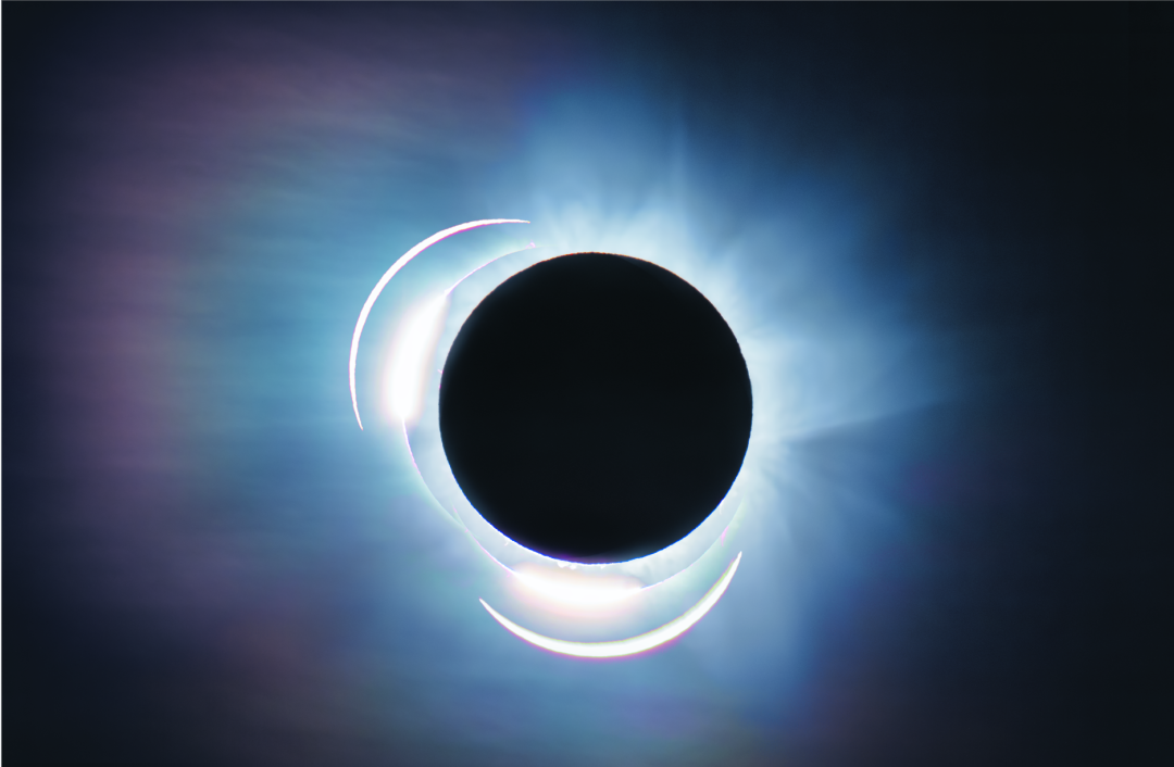 2012年11月从澳大利亚观测的日全食事件的合成图像。图片正中央是日全食时刻,两侧则展示了在月亮完全遮住太阳表面之前和之后产生的“钻石环”效应,以及在稍早和稍晚时刻出现的两道细长的“弯月”。