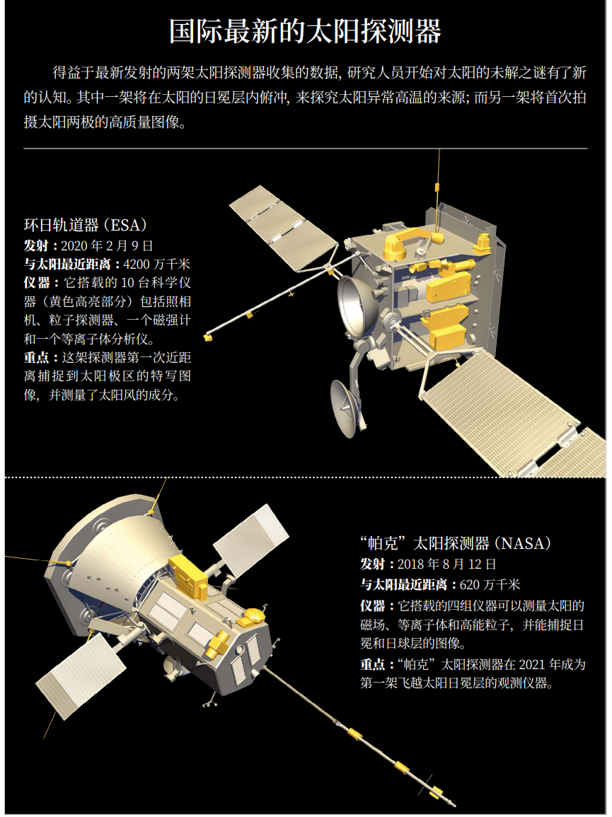 自1961年“探险者”10号(Explorer 10)发射以来,共有20多架用于观测太阳的探测器升空,其中就包括“帕克”太阳探测器和环日轨道器。在这些航天器中,有19架仍在工作,同时地面上也有众多用于观测太阳的天文台。很快,其他观测太阳的航天器和探空火箭就将与“帕克”太阳探测器和环日轨道器相伴,在地球大气层及地外空间中,以不同的视角一同观测太阳。NASA计划于2025年4月发射日冕和日球层偏振仪(Polarimeter to Unify the Corona and heliosphere),简称庞奇卫星(PUNCH),它将对新生的太阳风进行三维观测,来了解其在太阳系中产生与扩散的过程。未来的探测器可能会在更高纬度观测太阳,这对制造太阳探测器的工程师而言,将是一项巨大的挑战,但对于日球层物理学家而言,却是一项激动人心的任务。