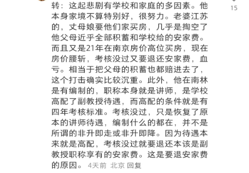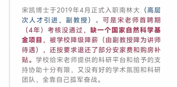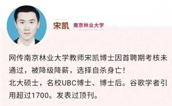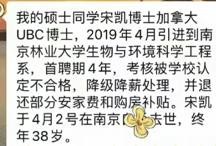5月2日,网上流传截图声称,南京林业大学教师宋凯博士因首聘期考核未通过,被降级降薪,遂于4月2日选择自杀身亡。