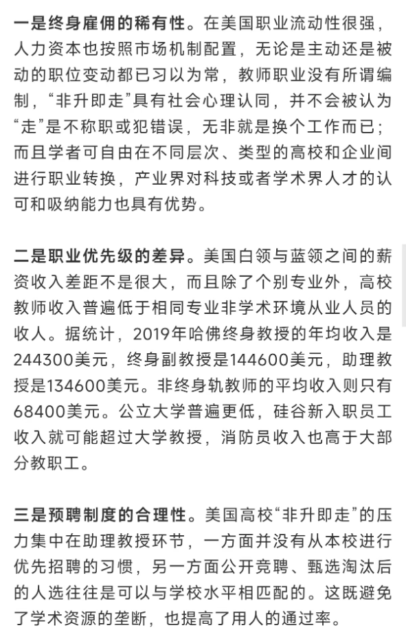 西方发展超百年的“非升即走”背后,已经有较为完善的人事制度基础:终身雇佣的稀有性,职业优先级的差异,以及预聘制度的合理性。