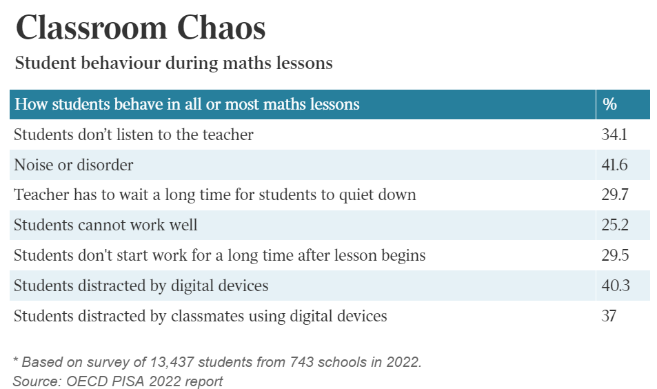 41.6%的澳洲学生表示数学课上经常有讲小话、发出噪音等扰乱课堂秩序的行为,高于受调查的81个国家30.3%的平均水平,也高于同类别的发达国家。