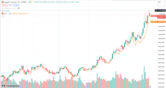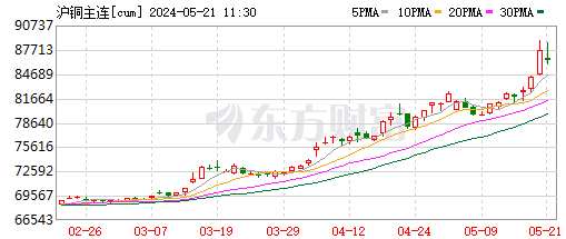同期,伦敦金属交易所(LME)铜期货价格亦上涨至10400美元/吨,而沪铜价格在5月16日盘中触及83000元/吨,达到了近18年来的最高水平。