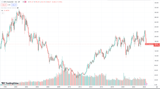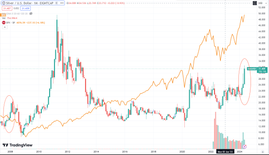 无论是2000年还是2008年,当白银的表现好于标普500时,还是当2008年泡沫破裂前白银的大涨时,或是说在爆破的破裂后,白银狂飙时,一切的商品价格都在向现代信用货币系统作出又一次的反扑与挑战。