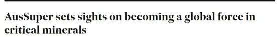 而AustralianSuper(澳大利亚最大的养老基金),准备在未来的三年对锂的投资增加一倍以上。高级投资组合经理卢克·史密斯 (Luke Smith) 向《 澳大利亚金融评论报》表示,规模达 3150 亿美元的 AusSuper 还准备在未来五年内通过投资澳大利亚、非洲以及北美和南美,向关键矿产领域投入更多资金。