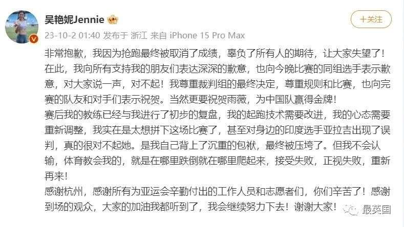 再比如,在前不久结束的亚运会上,吴艳妮在女子100米栏决赛中被判定抢跑犯规,随后她和印度的亚拉吉两人均向裁判提出抗议,而吴艳妮和裁判争论表示,是印度选手影响了她的比赛。