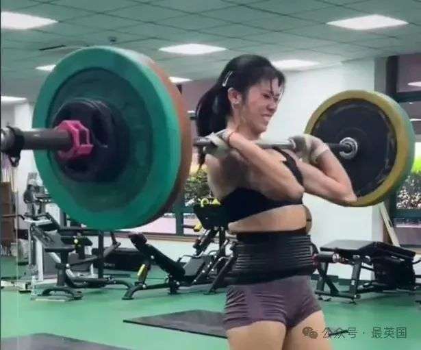 而另一张图片展示了吴艳妮费力举起杠铃的场景,可以看出她日常的力量/体能训练还是很扎实的。
