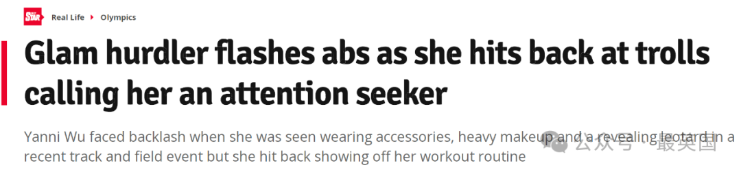 “吴燕妮在最近的一次田径比赛中因戴首饰、化妆浓妆、穿着超级紧身衣而遭到强烈反对的声音,但她用自己的训练来给这些质疑最有力的回击。”