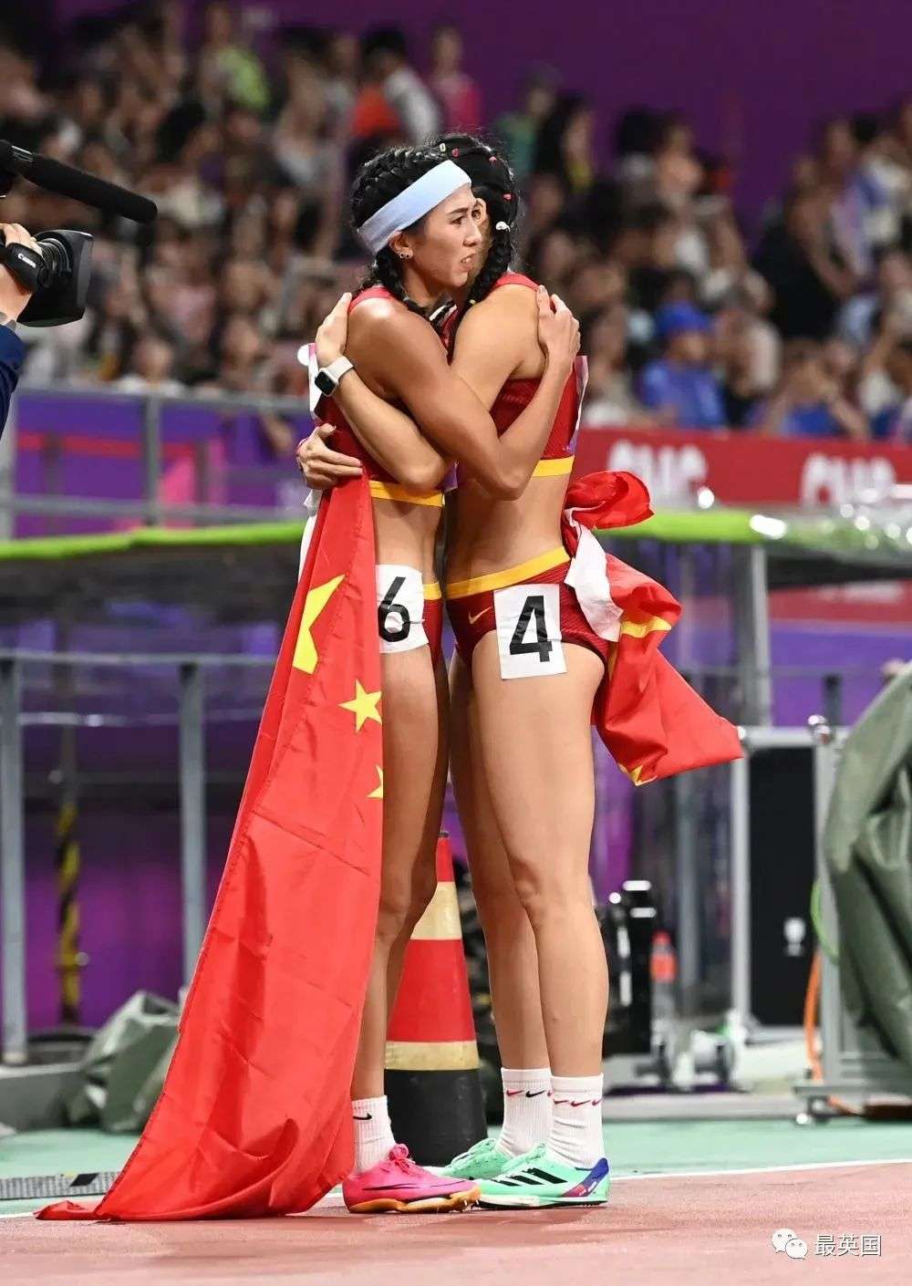 两位中国选手开心庆祝,吴甚至还披着国旗绕场一周。