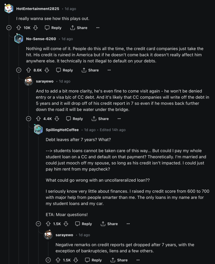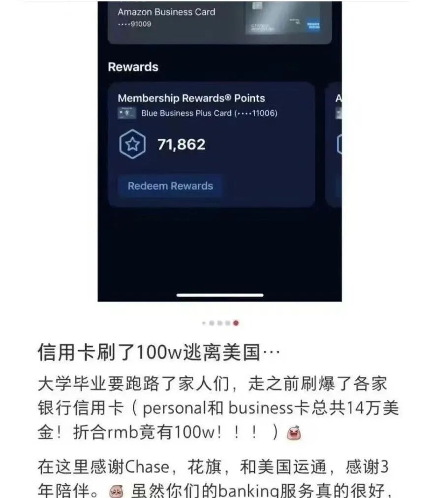 这段时间,某平台上疯传一个帖子。一个自称留学生的网友,炫耀刷爆了美国信用卡100万,然后逃离美国。