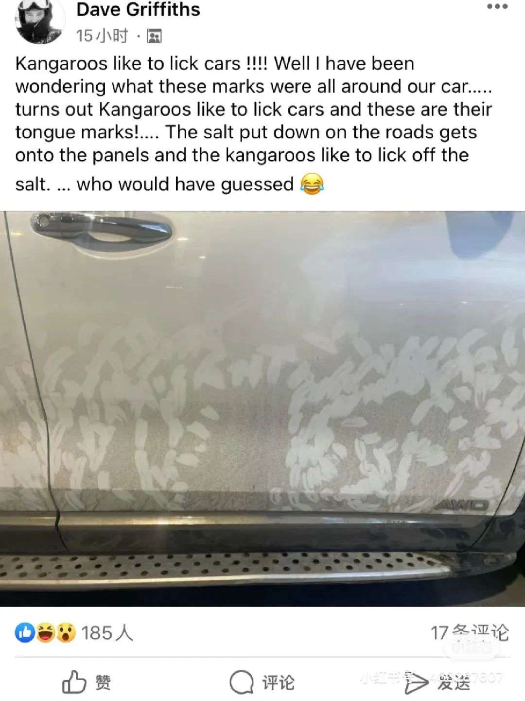 最近,一则来自Perisher雪友的帖子引发了热议,帖子主人发现自家汽车门上出现了舌头一样的痕迹。起初,这些奇特的痕迹引发了一阵困惑,但后来他们发现这些痕迹的来源竟然是袋鼠。原来,由于Perisher需要快速清除道路上的积雪,常常会在路面撒上大量的融雪盐。汽车行驶在这些道路上,飞溅的盐水会附着在车身底盘和侧门上。在冬天袋鼠们努力获取能量时,就会找到附着在车身上的盐分,从而留下了这些独特的痕迹。