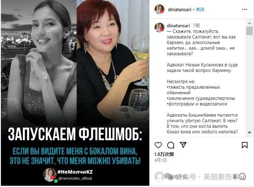去年11月9日,哈萨克斯坦发生了一起轰动全国的案件,嫌疑人是该国43岁的前经济部长宽迪克·比辛巴耶夫(Kuandyk Bishimbayev),受害者是他31岁的妻子萨尔塔纳特·努科诺娃(Saltanat Nukenova),两人结婚仅仅1年。