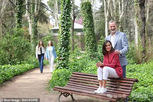 照片拍摄于他们位于马德里郊区的萨苏埃拉宫的庭院,背景是一片翠绿的草地,显得格外宁静祥和。