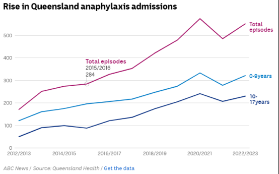 仅在昆士兰州,截至 2022-2023 财年的过去十年中,因食物不良反应而因过敏反应和过敏性休克而入院的 0-17 岁儿童人数增加了 300% 以上。