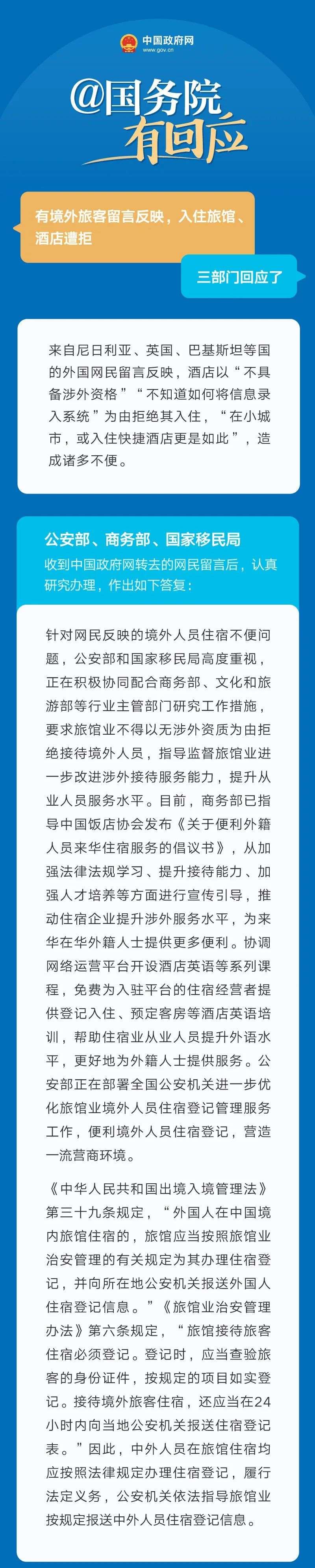 针对网民反映的境外人员住宿不便问题,公安部和国家移民局高度重视,正在积极协同配合商务部、文化和旅游部等行业主管部门研究工作措施,要求旅馆业不得以无涉外资质为由拒绝接待境外人员,指导监督旅馆业进一步改进涉外接待服务能力,提升从业人员服务水平。目前,商务部已指导中国饭店协会发布《关于便利外籍人员来华住宿服务的倡议书》,从加强法律法规学习、提升接待能力、加强人才培养等方面进行宣传引导,推动住宿企业提升涉外服务水平,为来华在华外籍人士提供更多便利。协调网络运营平台开设酒店英语等系列课程,免费为入驻平台的住宿经营者提供登记入住、预定客房等酒店英语培训,帮助住宿业从业人员提升外语水平,更好地为外籍人士提供服务。公安部正在部署全国公安机关进一步优化旅馆业境外人员住宿登记管理服务工作,便利境外人员住宿登记,营造一流营商环境。