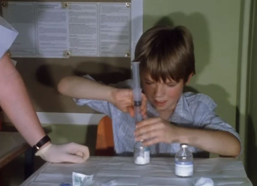 ● 接受第八凝血因子注射的血友病患者。图片来源:纪录片《脏血:真相调查》