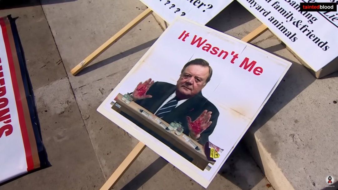 ● 前英国卫生大臣肯尼斯·克拉克的照片被印成标语,上面写着“不是我”。图片来源:纪录片《脏血:真相调查》