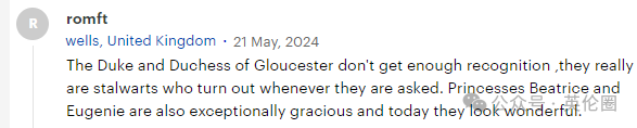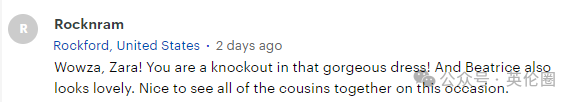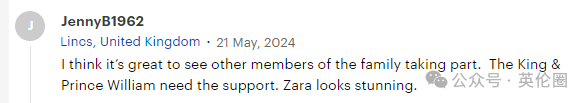 热心网友2号:我认为其他王室成员参与进来是件好事。国王和威廉王子都很需要支持。扎拉看起来相当惊艳。