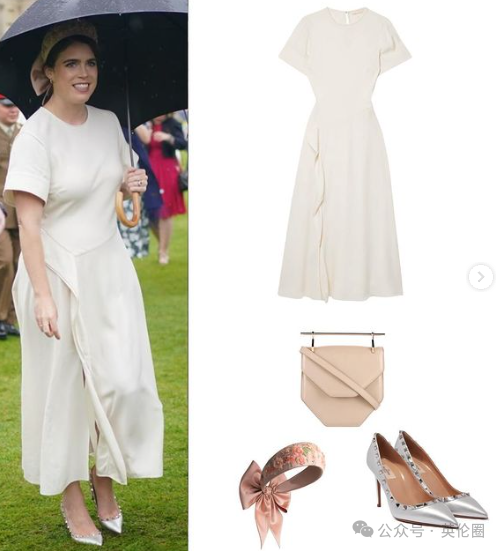 妹妹尤金妮身穿Ulla Johnson的白色褶边绉纱连衣裙,银色铆钉高跟鞋来自华伦天奴,发带和姐姐的一样都来自Emily-London: