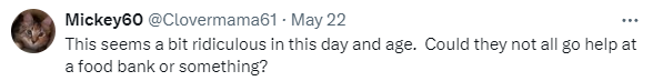 热心网友9号:在当今这个时代,这似乎有点荒谬。他们难道不能都去食物银行或者其它地方帮帮忙吗?