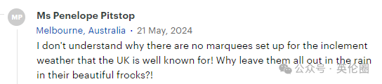 热心网友6号:我不明白为什么英国没有为向来著名的恶劣天气而搭建帐篷!为什么要让他们穿着漂亮的连衣裙在雨中淋雨?