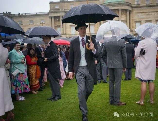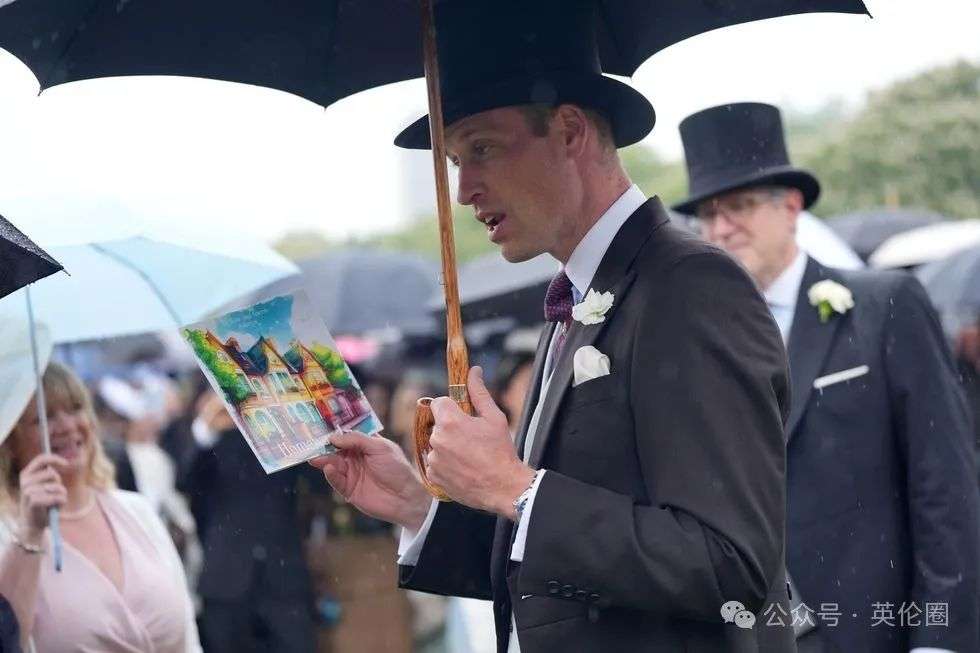 尽管天气不佳,但现场的气氛还是相当不错的。威廉撑着伞,与现场的宾客们交谈: