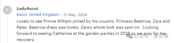 热心网友1号:很高兴看到威廉王子和他的堂兄弟姐妹碧翠丝、扎拉以及彼得在一起。碧翠丝的裙子很漂亮,扎拉的整体造型也恰到好处。期待在2025年的花园派对上见到凯特,让我们为她的康复而祈祷。