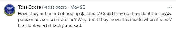 热心网友5号:他们没听说过弹出式凉亭吗?难道不能借给那些浑身湿透的退休老人几把伞吗?下雨的时候为什么不把活动转移到室内?这一切看起来有点俗气和悲伤。