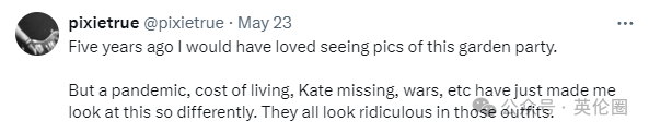 热心网友10号:五年前,我很想看看这场花园派对的照片。但疫情、生活成本、凯特失踪、战争等让我对此的看法大不相同。他们穿着那些衣服看起来都很可笑。