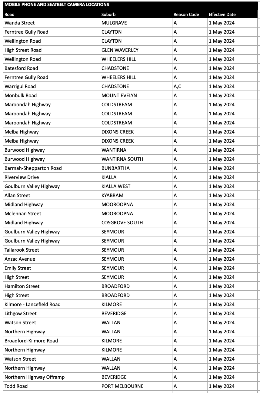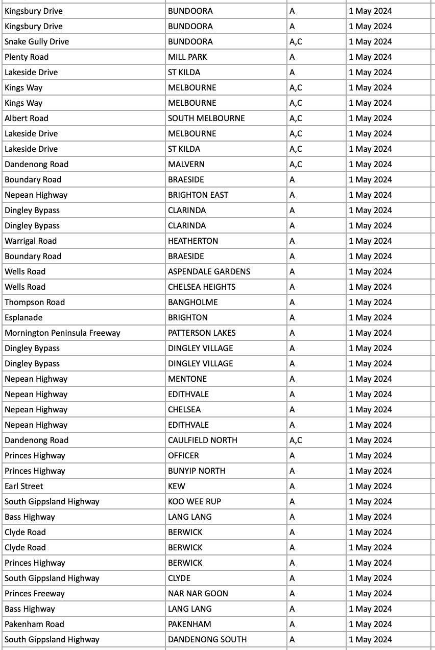 维多利亚州的移动摄像头计划由移动道路安全摄像头网络组成,每月运行约 15,900 小时。维多利亚州警方已批准在维多利亚州设立约 2,000 个地点。地址在:https://www.vic.gov.au/approved-mobile-camera-locations