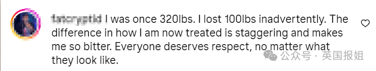“我以前320磅,现在瘦了100磅。瘦下来后就能体会到,以前被区别对待有多痛苦。