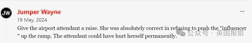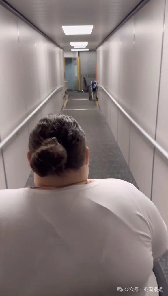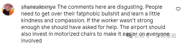 如果那个地勤太瘦弱,她应该请求别人的帮助。机场也应该投入资金购买电动轮椅,方便所有体型的人出行。”