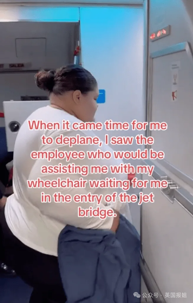 但当她下飞机时,却发现地勤人员只是站在廊桥入口处袖手旁观。尤其是看到她过来后,地勤人员上下打量一番就把轮椅推到一边,嘟囔着让她自己走着下去。