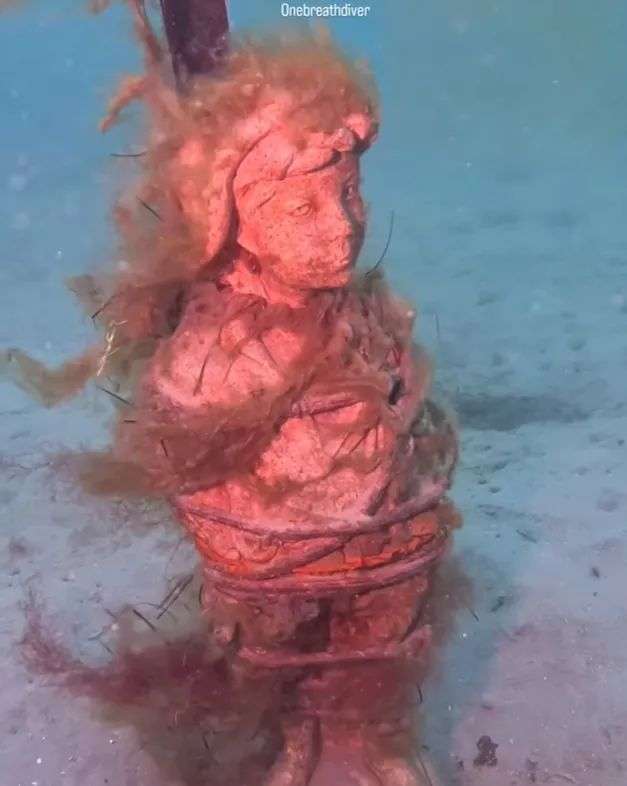 朱尔斯说,她几周前就在海底发现了排成一排的金属柱和PVC管,之间相距约5米,围成一圈,有些上面还绑着雕像。