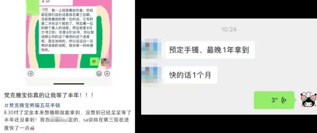 有不少网友在社交平台表示,梵克雅宝的等待期较长。“等了7个月还没拿到”“去年8月付了定金,到今年4月仍在排队”……