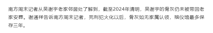 南方周末还提到一个细节,截止到今年清明节,吴谢宇骨灰依旧没有被家人接回安葬。
