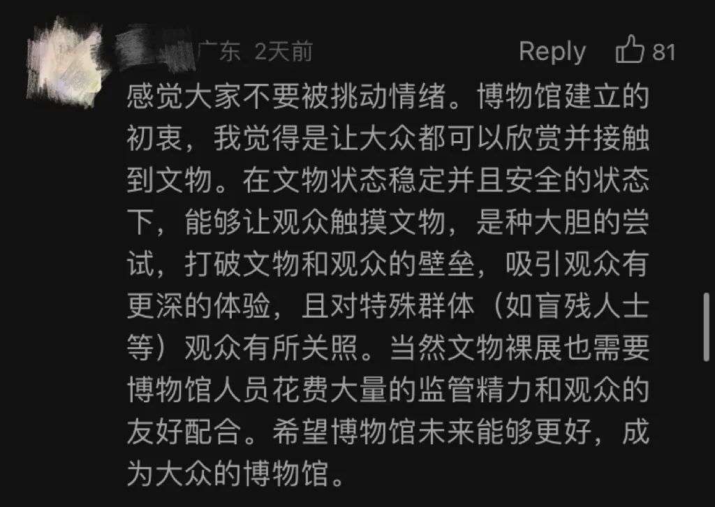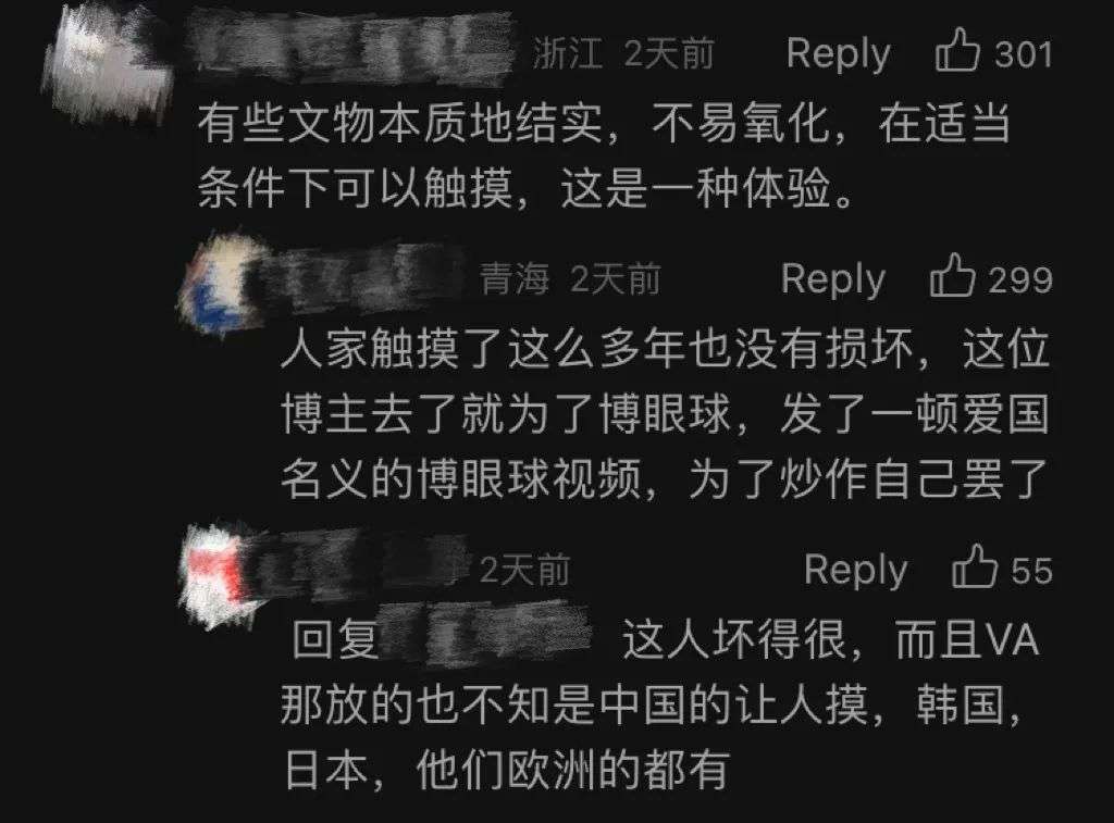 另一些网友也认为,该博主在视频里提到V&A从来不让游客触摸其他国家的文物,只让游客触摸来自中国的文物是否有任何事实依据?这是否只是他自己的猜测?