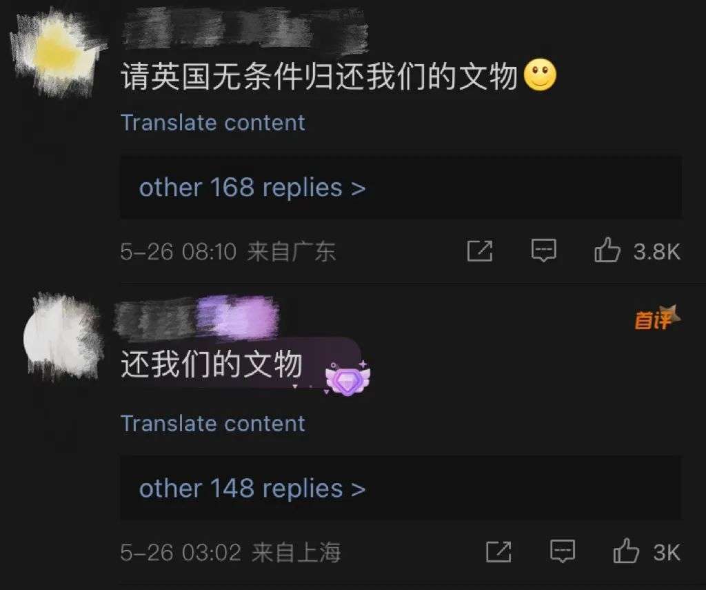 看得出网友面对这件事,真的是十分气愤,民族情绪都被点燃了,毕竟英国等西方列强国家的确从中国偷走抢走了不少文物。