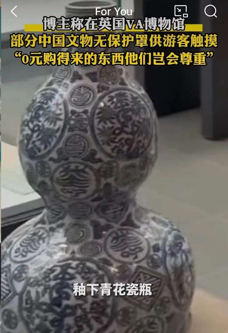 该博主还表示,不仅是这一件瓷瓶,还有部分来自中国的文物也都没有保护罩。为什么来自中国的文物就可以被游客触摸,而他们英国自己的文物就被保护得那么好。果然"0元购"的东西得不到尊重......