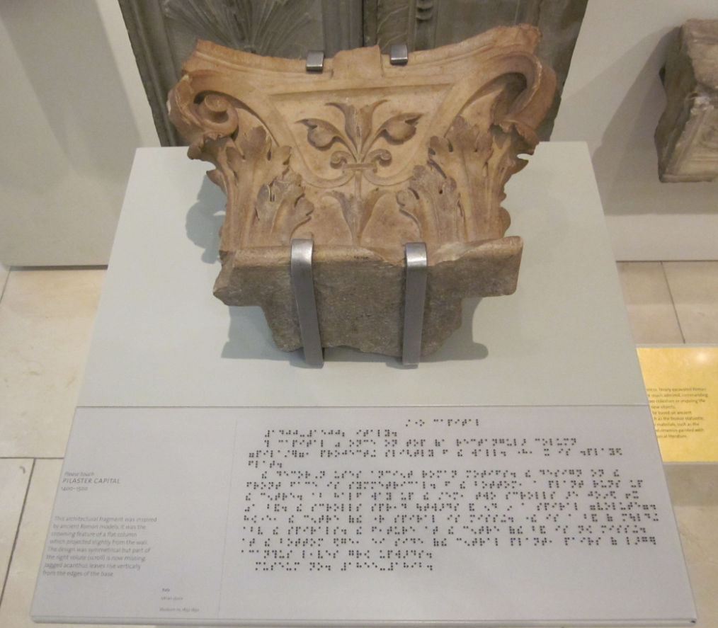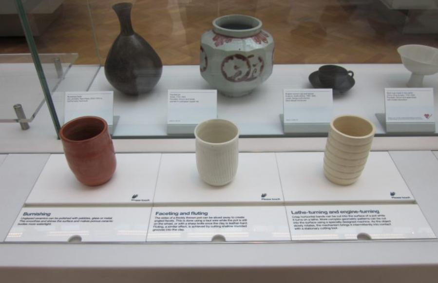 在2014年,V&A的展厅中就已经有许多可触摸物品了,包括雕塑展厅的聪明猫头鹰、釉面陶土、不同木材类型的雕刻样本、壁柱柱头、门环、可试戴的钢制手套、装饰陶瓷技术样本......