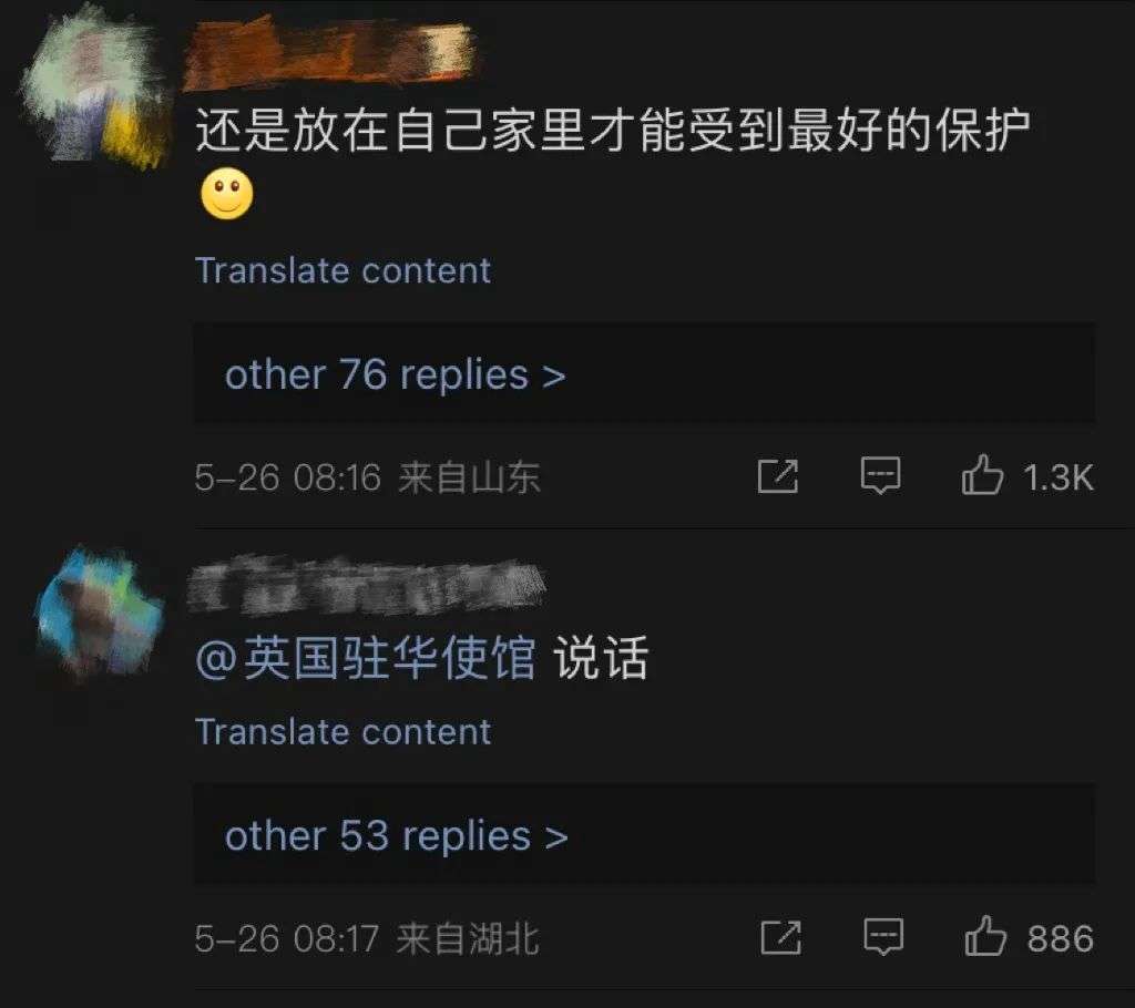 大家纷纷在评论区里留言,表示强盗不懂得珍惜,让英国归还文物,甚至还艾特了英国驻华使馆的官方微博账号,希望他们能给一个说法。