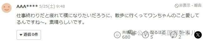 “下班后累得只想躺着了,还去外面散步,真是爱自己的狗狗啊。好棒。”
