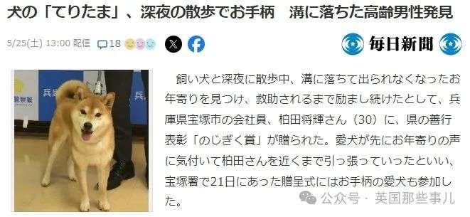 如今,柏田将辉也救助了掉进水沟里的七旬大爷,多亏了“第一发现者”——柴犬“照烧鸡蛋”。